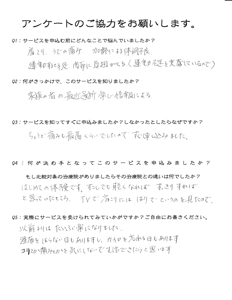 肩こり、うでの痛み、加齢による体調不良、運動すると手足、関節に負担がくる(運動不足を実感しているので)